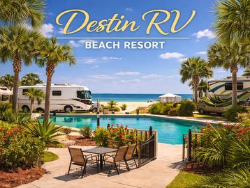Destin RV Beach Resort in Miramar Beach, Florida offers fully equipped concrete RV sites with 30- and 50-amp hookups, private beach access just steps from the resort, gated security, heated pool, free Wi-Fi, lush landscaping, and nearby dining and activities along the Emerald Coast.