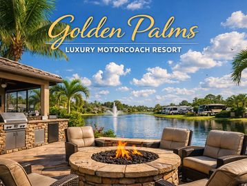 Golden Palms Luxury Motorcoach Resort in Fort Myers is a gated, upscale RV community designed for Class A and Super C owners. Oversized, big-rig-friendly lots are set around a 22-acre lake in a tropical setting, with space for custom casitas, outdoor kitchens, fire pits, and more. Enjoy resort-style living with amenities and year-round Southwest Florida sunshine.