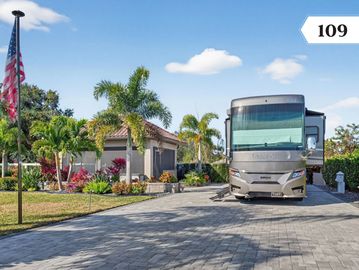 Site #109 is an oversized .27-acre deeded RV homesite in Golden Palms Luxury Motorcoach Resort, featuring a screened pavilion with outdoor kitchen, expansive paver pad, fire pit, and lush landscaping. Enjoy resort-style amenities and a prime Fort Myers location just minutes from beaches, dining, and entertainment. Luxury motorcoach living at its best.