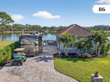 Turnkey waterfront motorcoach lot with casita in Golden Palms Luxury RV Resort. East-facing lake views, screened patio, and included furnishings/appliances make it move-in ready. Gated, Class A/Super C community with pool, clubhouse, pickleball, hot tub, and dog park—just bring your coach and enjoy.